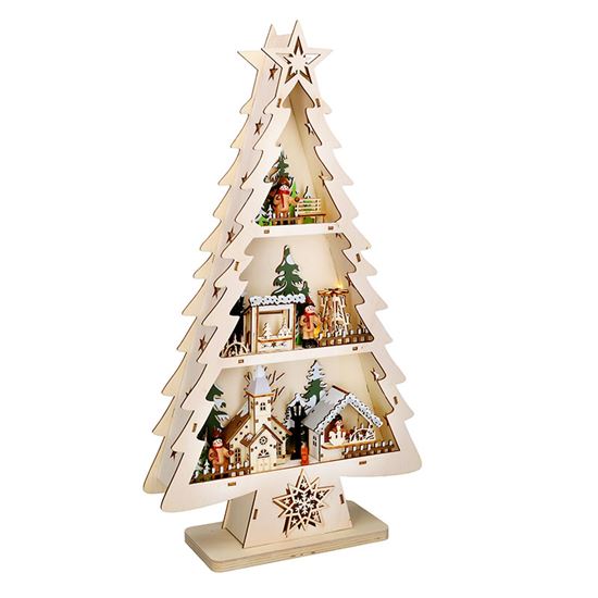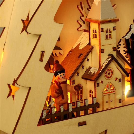 Menší varianta oblíbeného dřevěného stromku je vysoká 53 cm a šířka 30 cm. Je vybavena 13 LED diodami, které září teple bílým světlem a osvěcují drobné barevné dekorace rozmístěné po celé ploše. Barevné prvky v kombinaci s přírodním podkladem působí hravě a vesele, ideální do dětského pokoje nebo jako doplněk k tradiční výzdobě.
