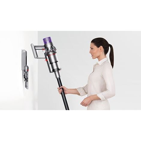 Vysavač Dyson Cyclone V10™ zasunete do nástěnné dobíjecí stanice, kde se dobije. Uložit zde můžete také hubice, které tak budou vždy po ruce připraveny k dalšímu úklidu.