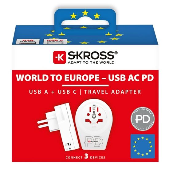 Spolehlivé připojení na cestách Adaptér SKROSS World to Europe USB AC20PD umožňuje bezpečné použití zařízení z více než 200 zemí v českých a evropských zásuvkách typů E a F. Připojí uzemněné i neuzemněné vidlice přívodních kabelů, bez problémů zapojíte vše od notebooků až po fény. Výkonné USB porty umí nabíjet až 20 W na USB-C a 18W na USB-A a rychle doplnit energii telefonům, tabletům a další elektronice. A bez nutnosti odpojovat přívodní šňůru z hlavní zásuvky.