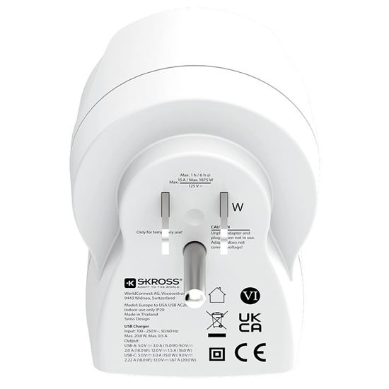 Adaptér SKROSS Europe to USA USB AC20PD umožňuje bezpečné použití evropských zařízení v zásuvkách Spojených států a zemích s USA standardem typ B. Připojí uzemněné i neuzemněné vidlice přívodních kabelů, bez problémů zapojíte vše od notebooků až po fény. Výkonné USB porty umí nabíjet až 20 W na USB-C a 18W na USB-A a rychle doplnit energii telefonům, tabletům a další elektronice. A bez nutnosti odpojovat přívodní šňůru z hlavní zásuvky.