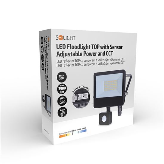 Výkonný LED reflektor řady TOP s integrovaným pohybovým senzorem přináší maximální pohodlí a efektivitu pro venkovní osvětlení. Uživatel může snadno přepínat mezi dvěma úrovněmi výkonu – 30W (3900lm) a 20W (2600lm), což umožňuje přizpůsobit intenzitu světla podle konkrétní situace. Dále je možné nastavit teplotu světla na teplou, neutrální nebo studenou bílou (3000K/4000K/5000K), a to pomocí praktického přepínače na těle reflektoru.