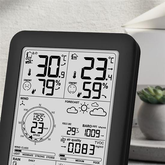 Tato profesionální meteostanice poskytuje kompletní přehled o počasí a kvalitě ovzduší s možností propojení s aplikací Smart Life / Tuya Smart, kde lze zobrazit aktuální hodnoty a přehledné grafy meteorologických dat. Nabízí automatické nastavení času přes internet, kalendář do roku 2099, zobrazení dnů v týdnu ve 15 jazycích, dva budíky s funkcí odloženého buzení (OFF nebo 5–60 min) a monitorování kvality ovzduší pomocí snímače škodlivých látek TVOC s 8 úrovněmi koncentrace (0–9,999 mg/m3). Měří vnitřní (-20 °C až 50 °C) a venkovní teplotu (-40 °C až 70 °C), vlhkost (20 % až 95 %), atmosférický tlak (600–1100 hPa), srážky (0–9999 mm) a vítr (rychlost do 180 km/h, směr 0–359°) s 12 úrovněmi Beaufortovy stupnice. Sleduje intenzitu světla (0–128 klux), UV index (0–15) a úroveň sluneční expozice. Disponuje 4 úrovněmi podsvícení displeje pro perfektní čitelnost. Bezdrátový senzor s frekvencí 433,92 MHz RF má dosah až 100 m v otevřeném prostoru a umožňuje připojení až 3 dalších senzorů vlhkosti a teploty. Napájení meteostanice zajišťuje DC 5V / 1A adaptér nebo 2× AA baterie, měřící konzole 3× AA baterie, bezdrátové senzory 2× AA baterie. Díky moderním technologiím, široké škále měření a propojení s aplikací je ideální volbou pro všechny, kteří chtějí mít profesionální meteorologická data v reálném čase.
