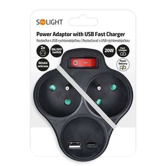 Solight rozbočka s USB A+C rychlonabíječkou 20W PD, 2 x 10A, černá, vypínač | SOLIGHT
